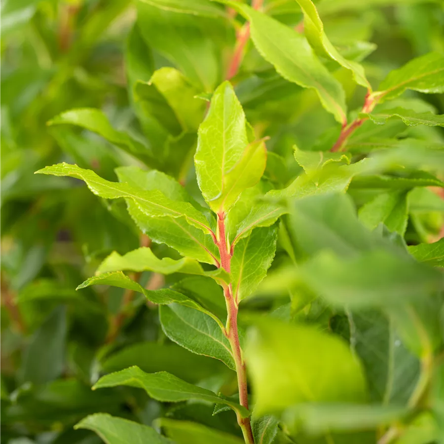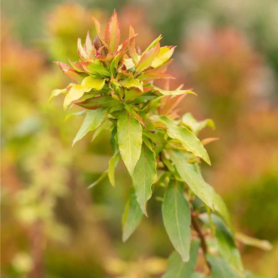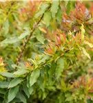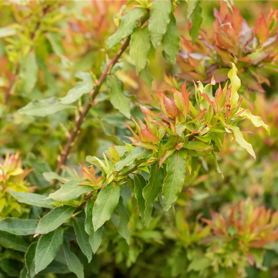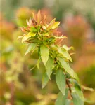 Die sommergrünen Blätter der Heidelbeere 'Lucky Berry'® sind mittelgrün, lanzettlich, wechselständig. Heidelbeere 'Lucky Berry'® zeigt sich leuchtend orange-rot bis gelb im Herbst.