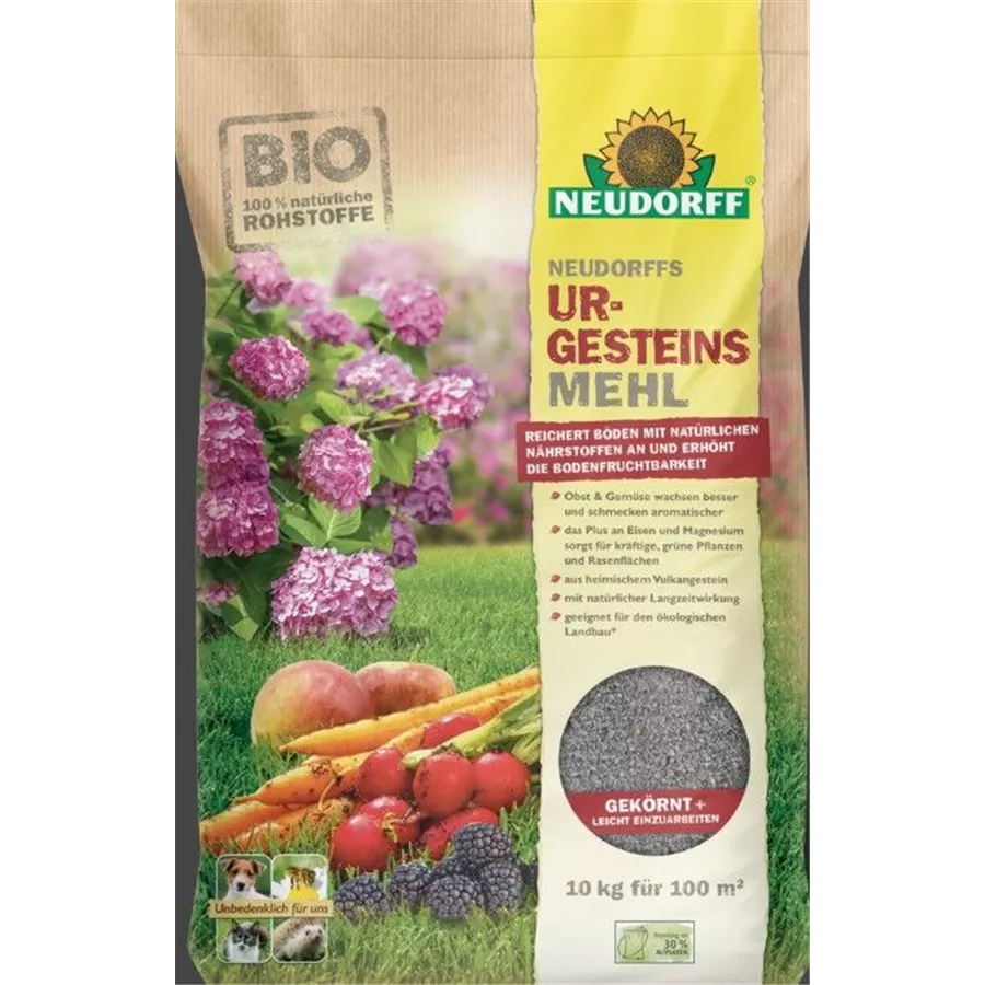 Bodenhilfsstoff hergestellt unter Verwendung von Diabasgesteinsmehl. Zur Wiederanreicherung des Bodens mit Mineralsubstanz und Spurenelementen. Besonders gut geeignet für Moorbeetpflanzen und Immergrüne.