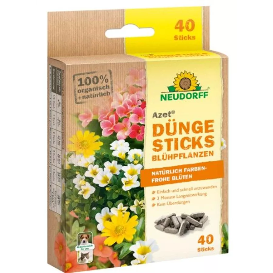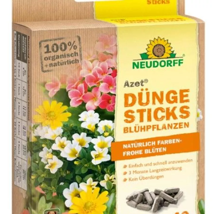 Organischer NPK-Dünger 7-3-6 für Zierpflanzen mit natürlicher Langzeitwirkung (mindestens 100 Tage). Blumentöpfe: bis 12 cm Topfdurchmesser: 1 Stick 13-15 cm: 2 Sticks, 16-18 cm: 3 Sticks, 19-20 cm: 4 Sticks. Für jeden weiteren cm zusätzlich 1 Stick. Balkonbepflanzung: 2 bis 3 Sticks pro Pflanze, je nach Größe.