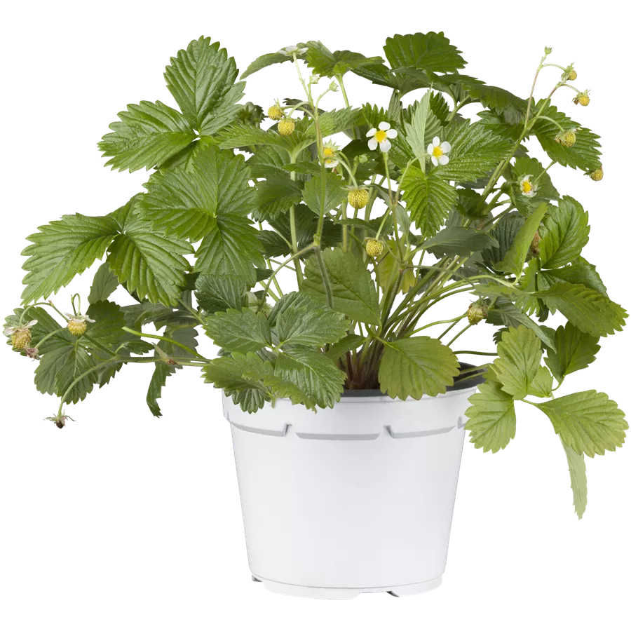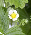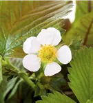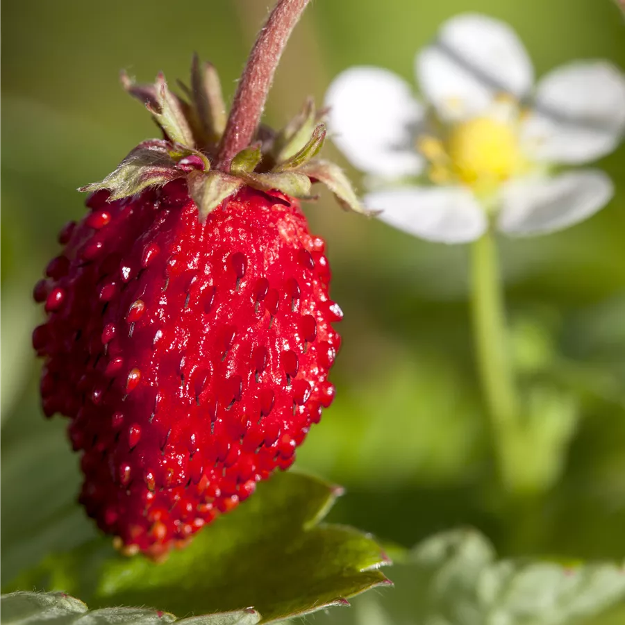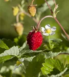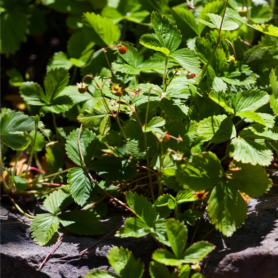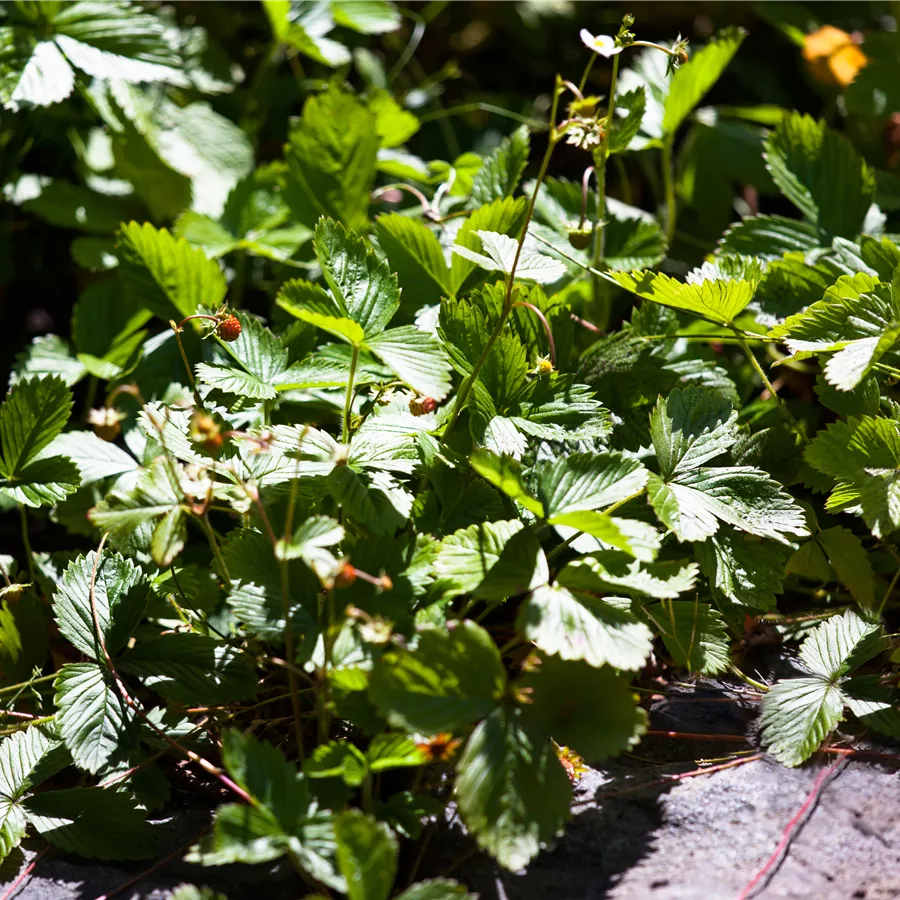 Die Gewöhnliche Wald-Erdbeere (Fragaria vesca) bildet rote Beeren. Diese sind süß im Geschmack. Für eine ertragreiche Ernte ab Mai schaffen durchlässiger, humoser, schwachsaurer Boden und ein sonniger Standort optimale Bedingungen. Ihre weißen Blüten sind eine schöne Erscheinung. Die Gewöhnliche Wald-Erdbeere wird mit ihrem ausläuferbildenden und kriechenden Wuchs etwa 20 cm hoch und 1 m breit, dadurch kann sie hervorragend in Töpfen auf Balkon oder Terrasse angebaut werden.